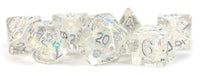 These latest MDG resin dice have unique inclusions that will add flare to any gaming table.These are full-sized,16mm polyhedral dice sets that come with7 dice:(d4,d6,d8,d10,d10%(00-90),d12,and d20).