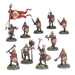 This multipart plastic kit builds 10 Freeguild Steelhelms, the soldiers of the line for the Free Cities. Each Steelhelm is armed with a sturdy shield and a one-handed weapon such as a sword, axe, or mace. You can build one model as a veteran Sergeant-at-Arms with a hammer and crested helm, one as an inspiring Battle Priest carrying a holy relic, and another as a Steelhelm Herald with a trumpet and a flowing, icon-topped banner.