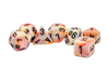 Contains 7 Dice that are Tan, Pink, Blue, Pastel Swirls with Black Ink in the following Shapes: